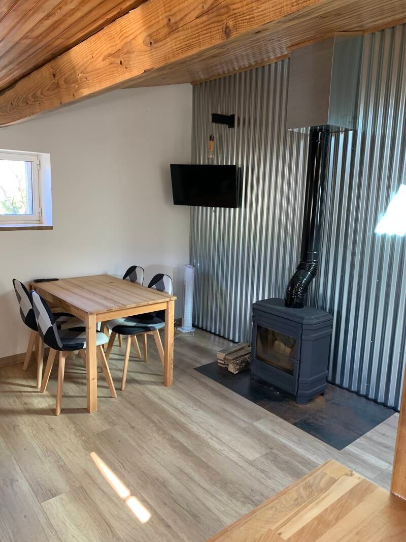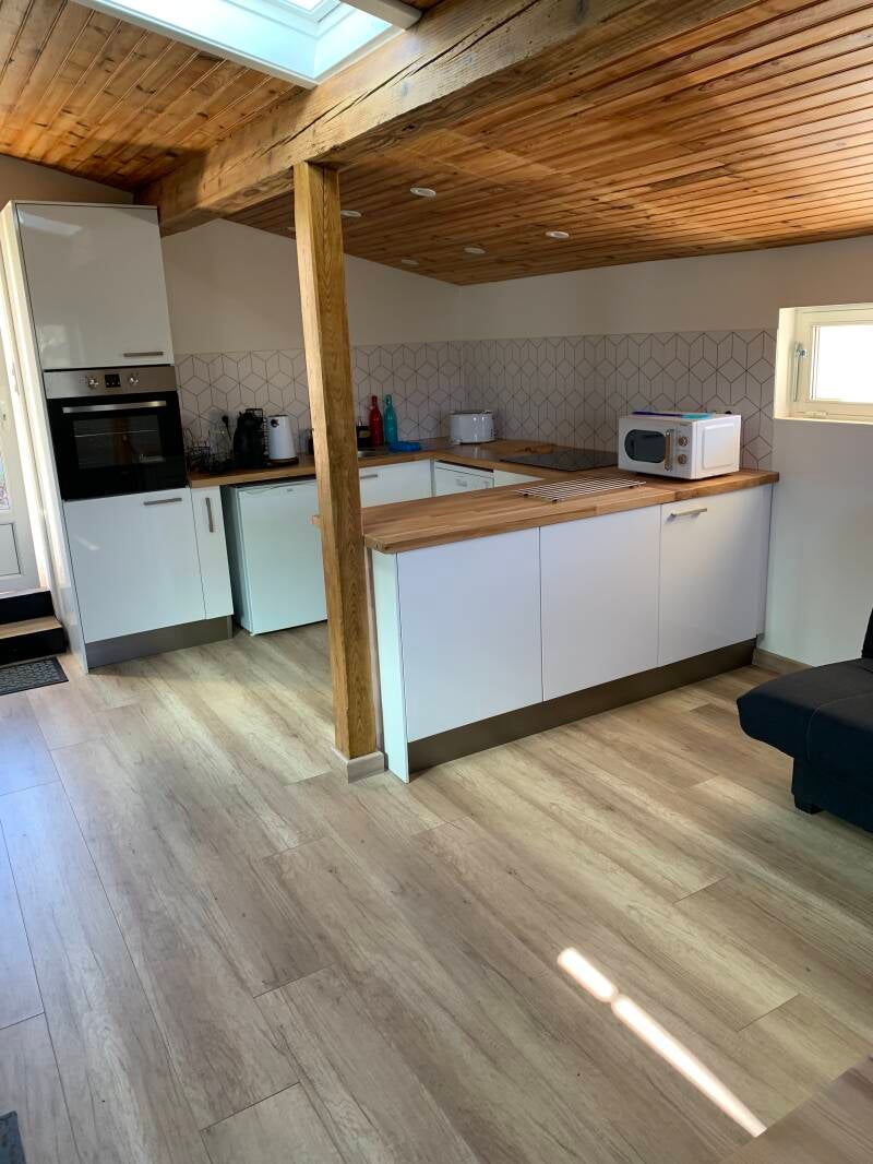 Une pièce de vie avec sa cuisine entièrement équipée (plaque induction, four, four micro-onde, bouilloire, cafetière, grille pain, réfrigérateur, vaisselle, ...), un clic-clac linge de lit fourni